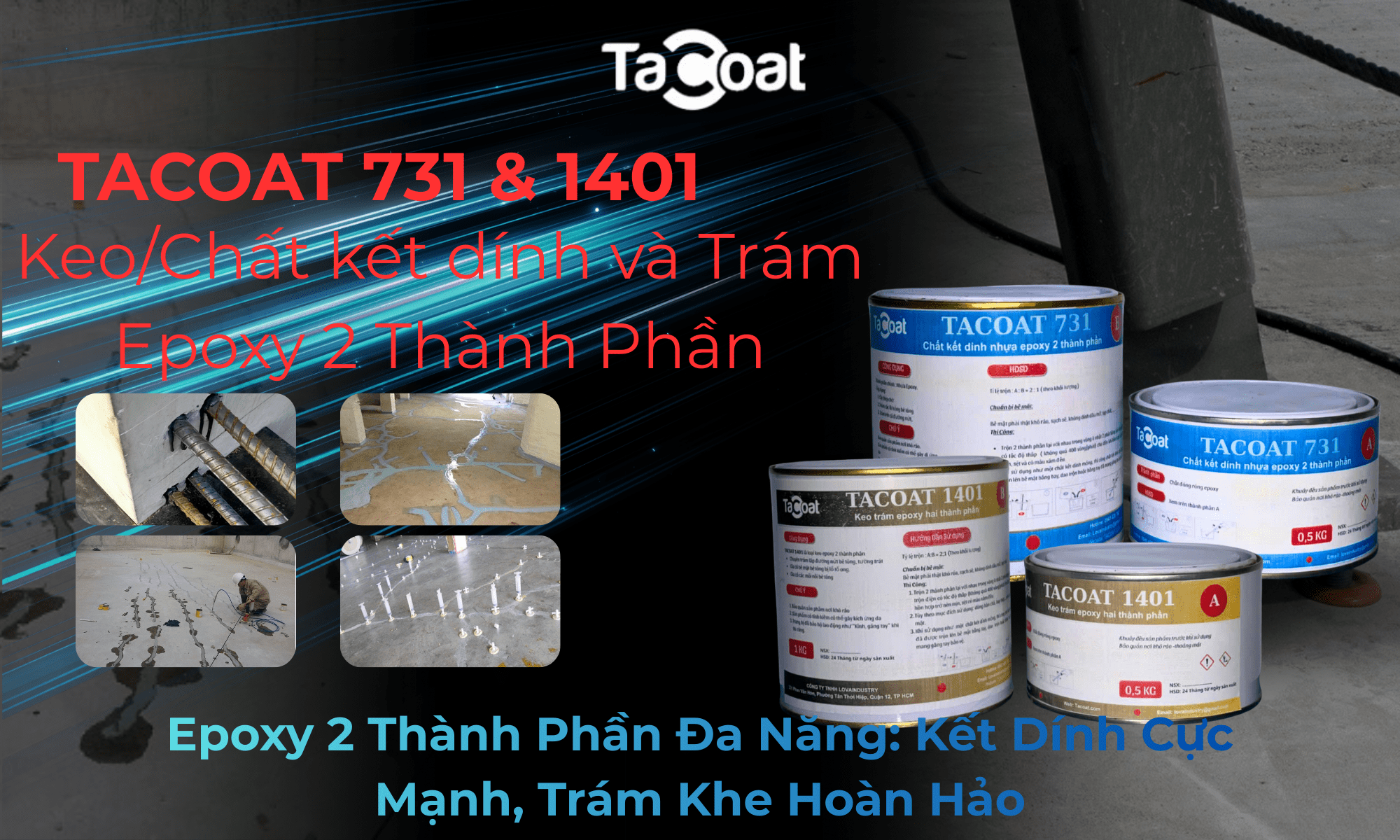 "Cung cấp phụ gia hóa chất xây dựng chuyên dụng: Keo Epoxy 731 cấy thép, 1401 trám nứt bê tông, Epoxy Resin đổ mặt bàn và Keo dán gạch dưới nước. Giải pháp gia cố kết cấu và chống thấm bền bỉ, giá tốt nhất thị trường. Mua ngay!"