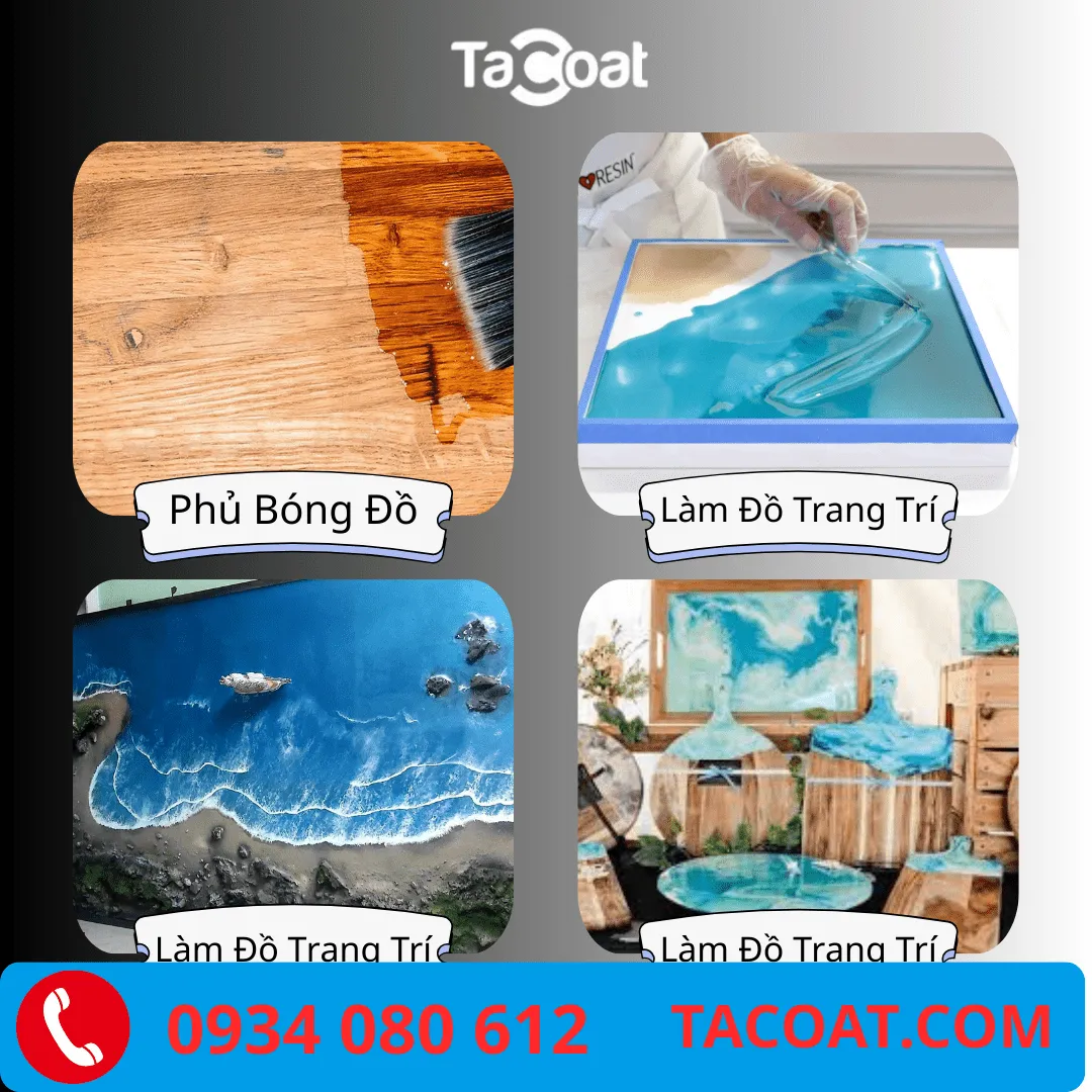 Phủ bề mặt (Coating): Phủ lên tranh 3D, mặt bàn, sàn nhà hoặc các bề mặt trang trí khác để tạo lớp bảo vệ trong suốt, sáng bóng như gương.