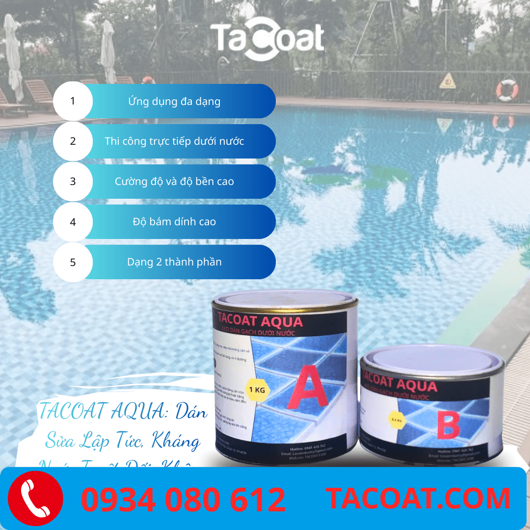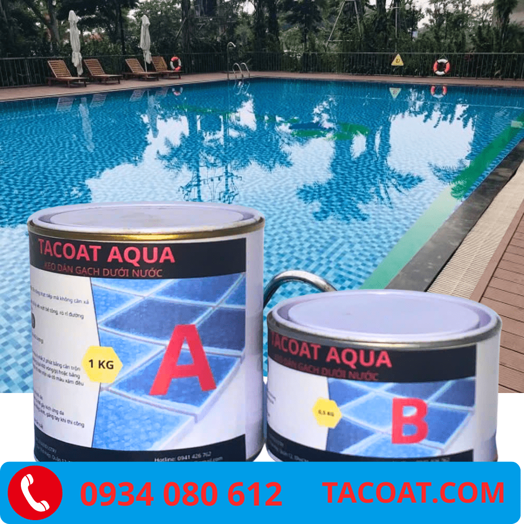 TACOAT AQUA là loại keo dán gạch Epoxy hai thành phần (Thành phần A: Nhựa, Thành phần B: Chất đóng rắn) chuyên dụng cho các khu vực tiếp xúc trực tiếp hoặc ngập nước liên tục. Sản phẩm được thiết kế đặc biệt để đóng rắn và đạt độ bám dính tối đa ngay cả trong môi trường nước.