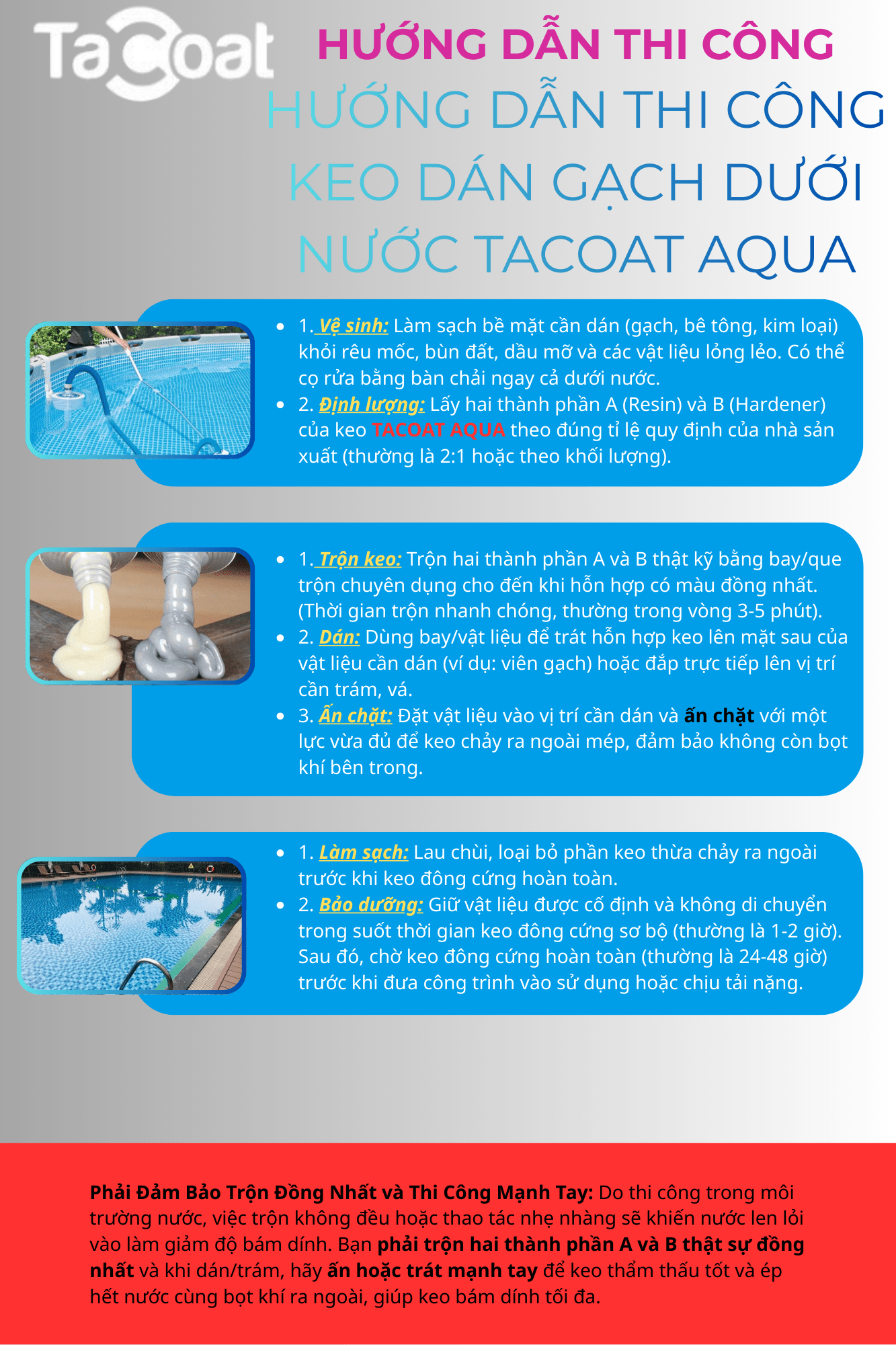 Việc thi công cần tuân thủ nghiêm ngặt để đạt hiệu quả bám dính tối đa, đặc biệt là khi thi công trực tiếp dưới nước: