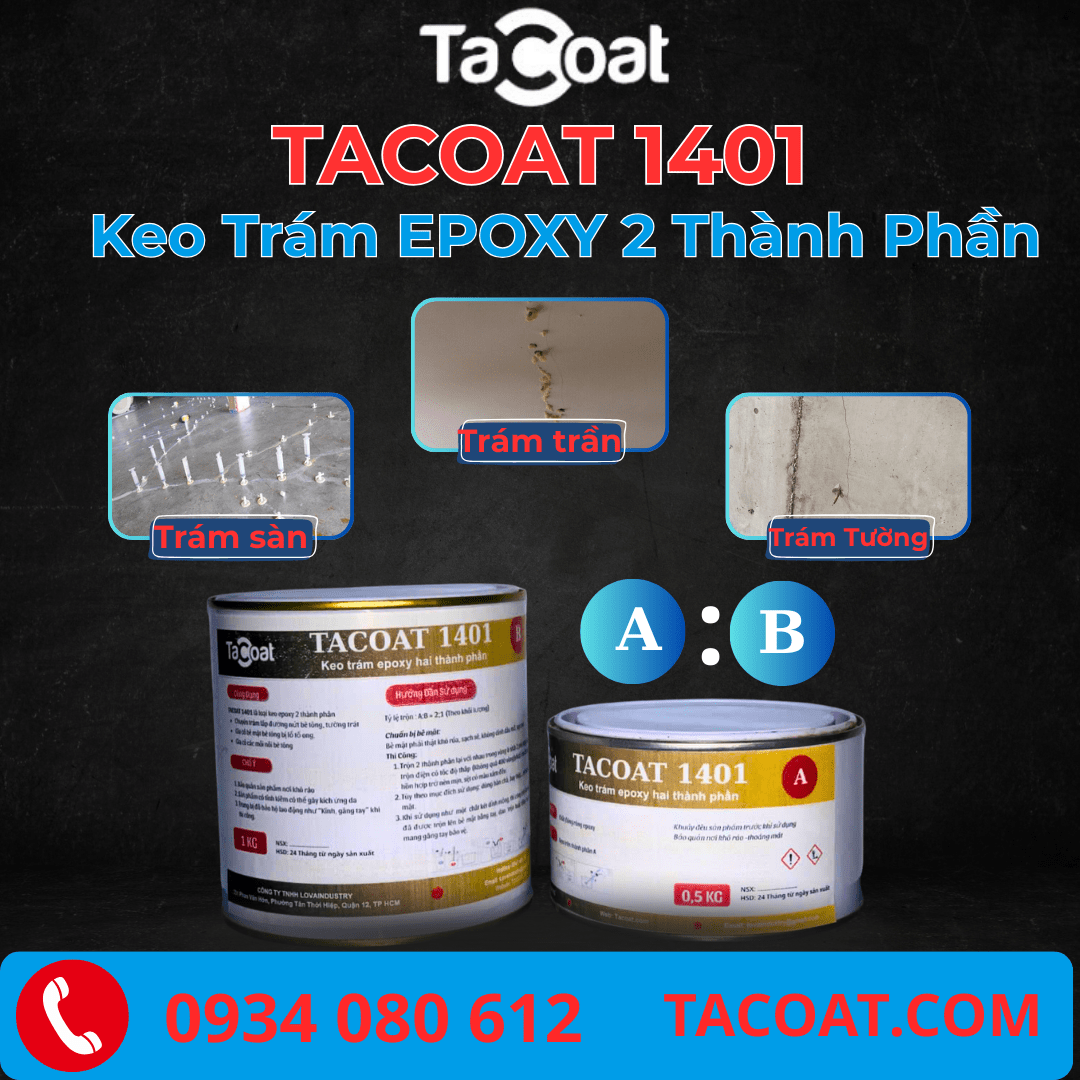 TACOAT 1401 là một loại keo trám vá, sửa chữa chuyên dụng, gốc nhựa Epoxy biến tính hai thành phần. Sản phẩm được thiết kế để xử lý và trám kín các vết nứt, khe hở trên bề mặt tường, sàn và cấu kiện bê tông.